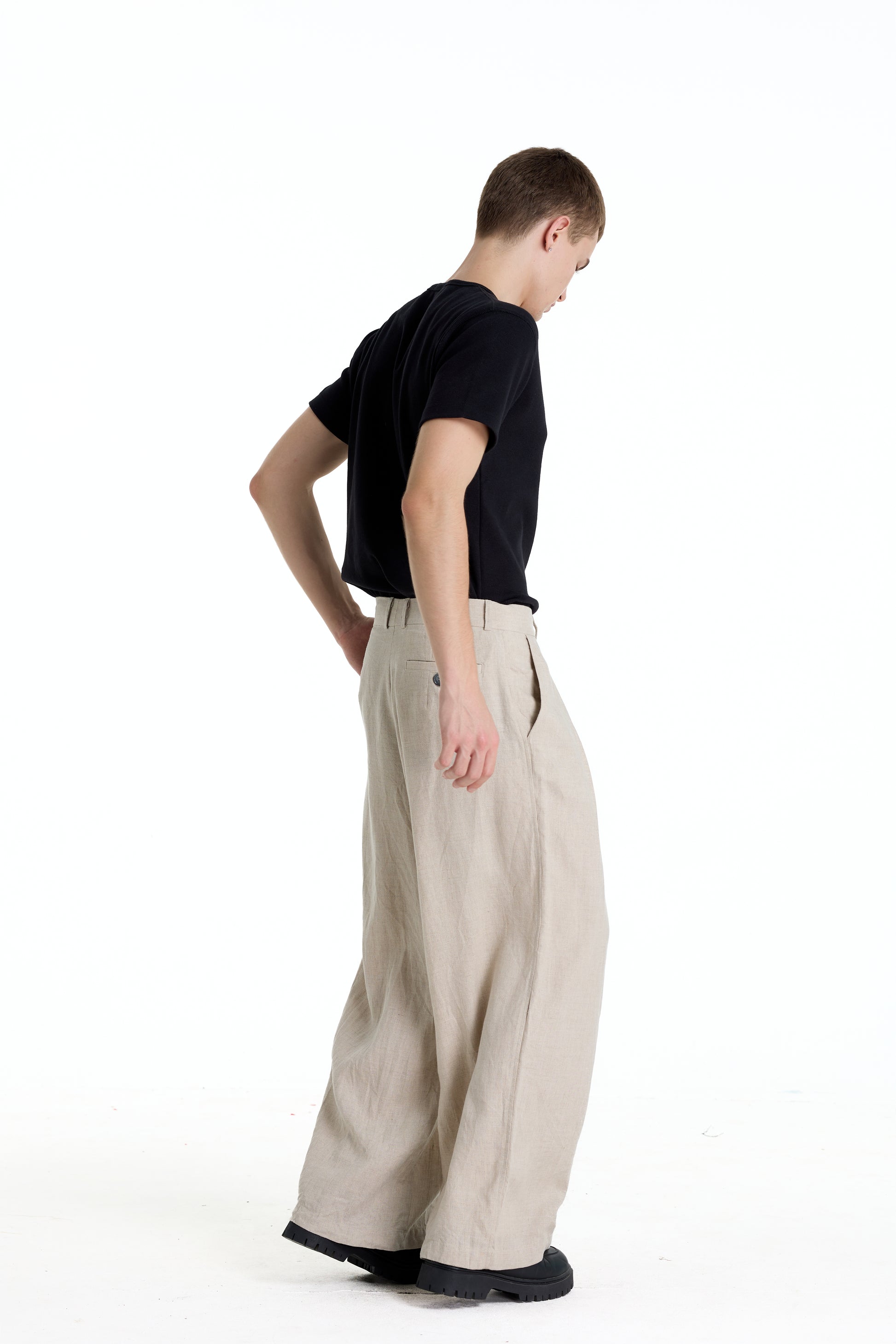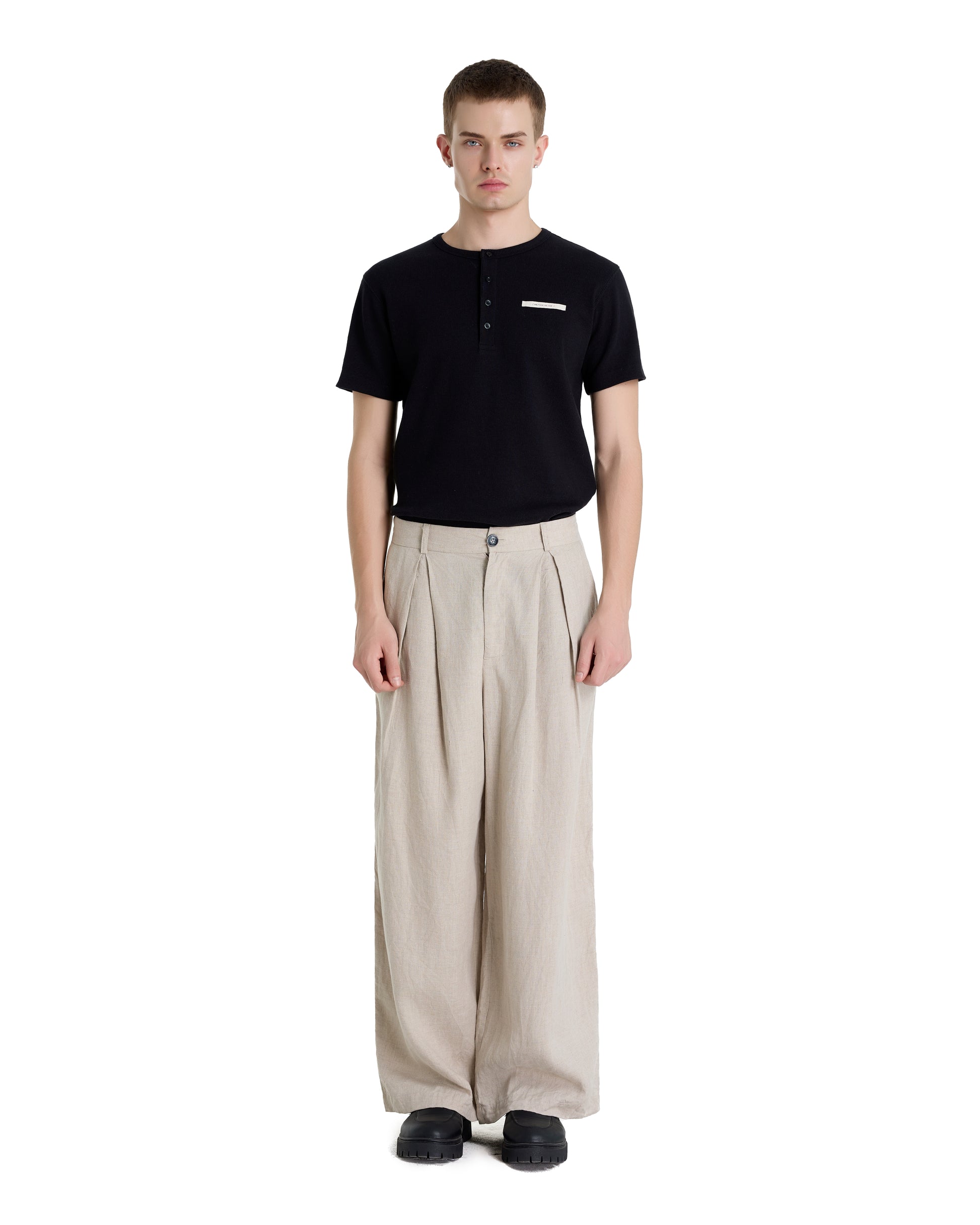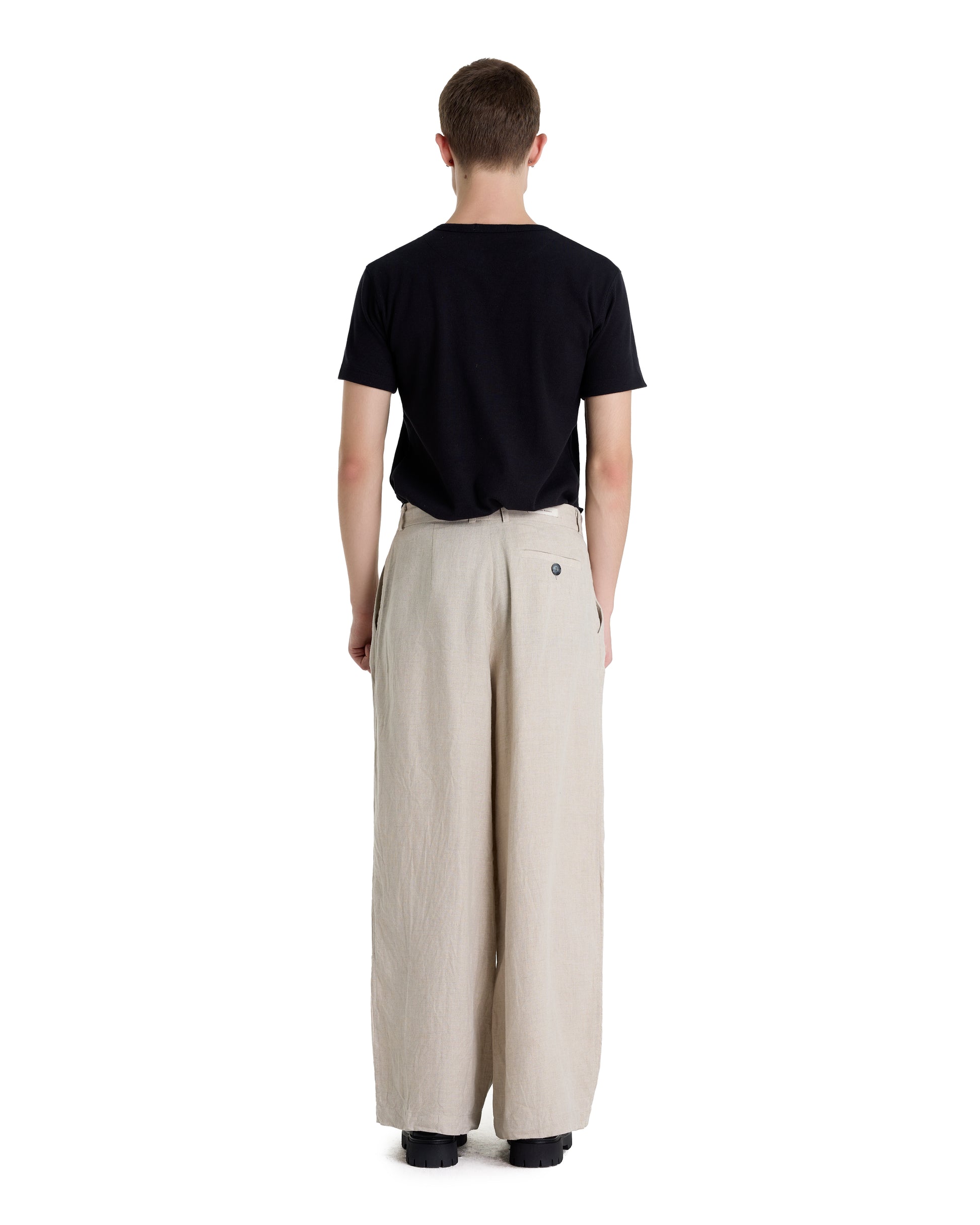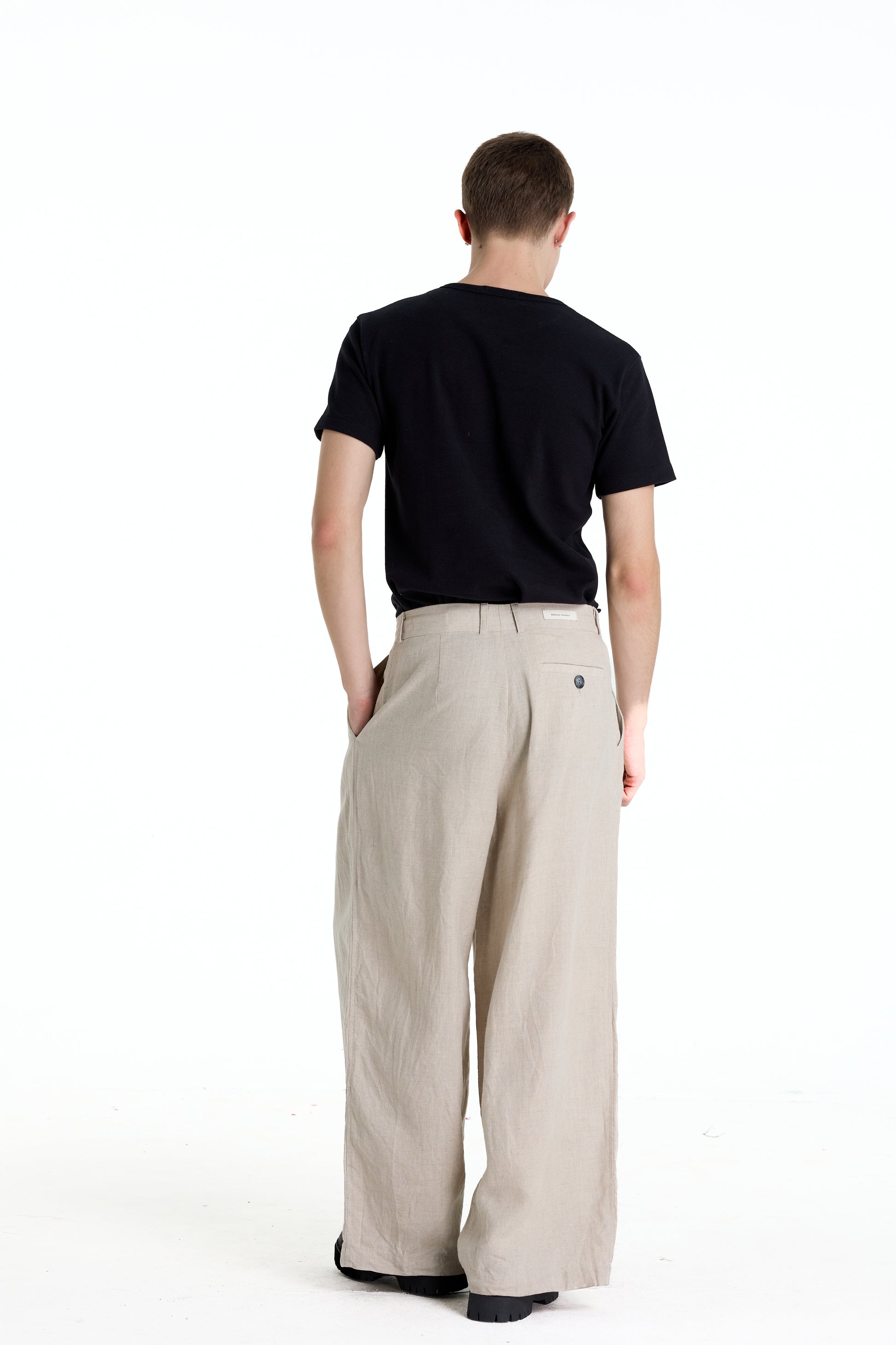 Wide-leg linen trousers in a refined oatmeal tone, featuring a clean pleated front for a relaxed yet structured silhouette. Crafted from breathable natural linen, the fabric offers a soft drape and exceptional comfort, ideal for warm climates. The minimalist design and neutral color make these trousers easy to style for modern smart-casual and everyday wear.