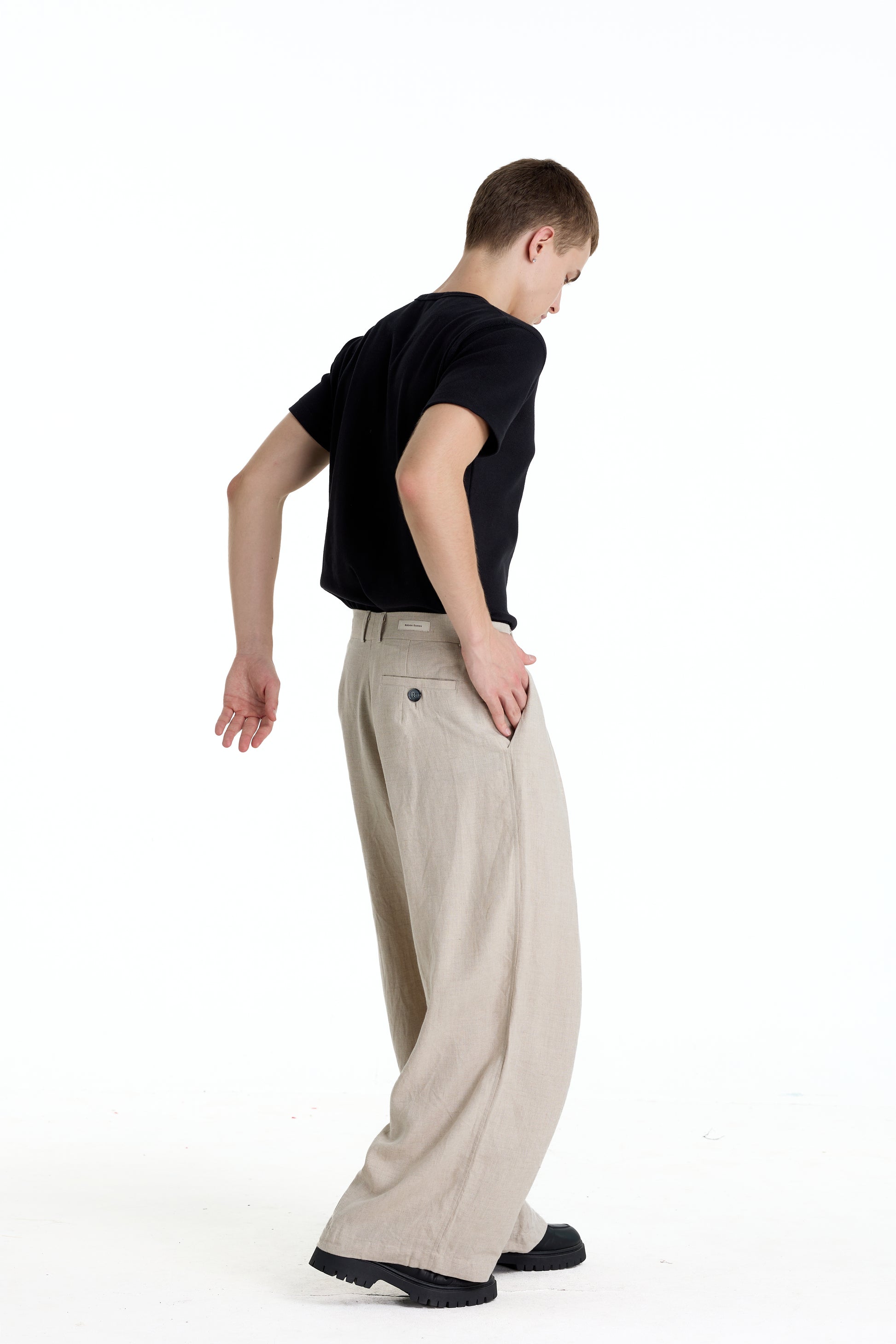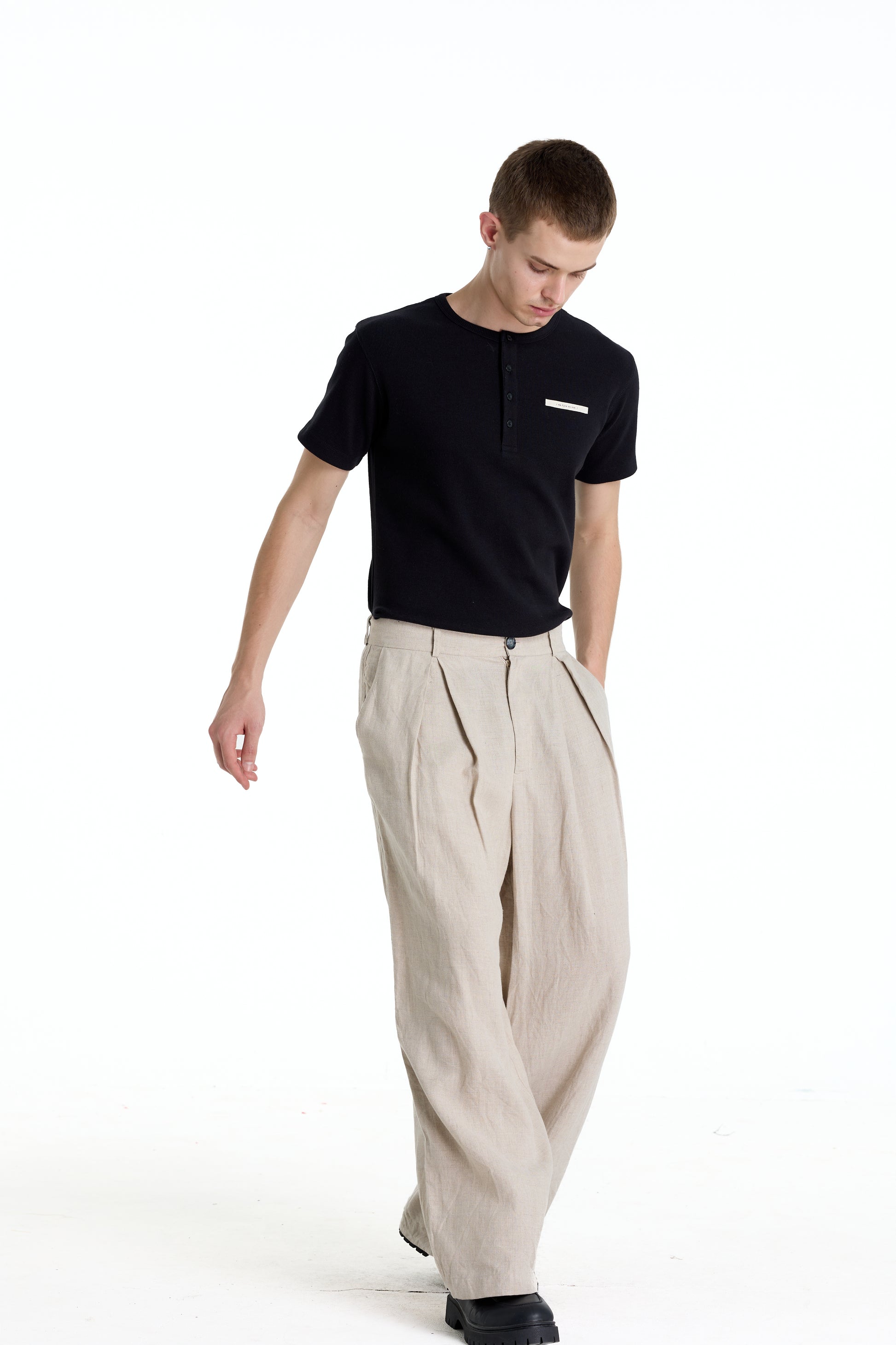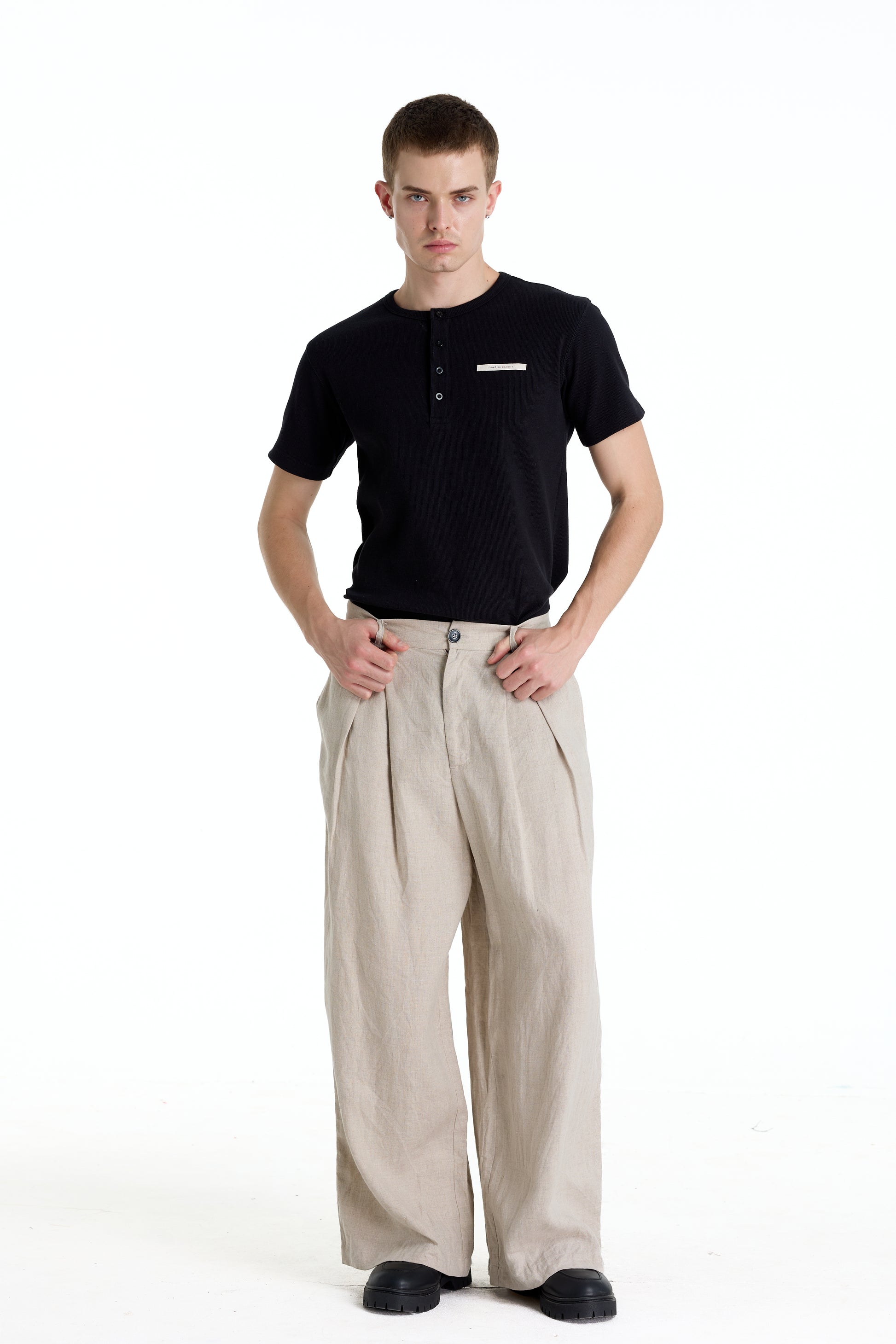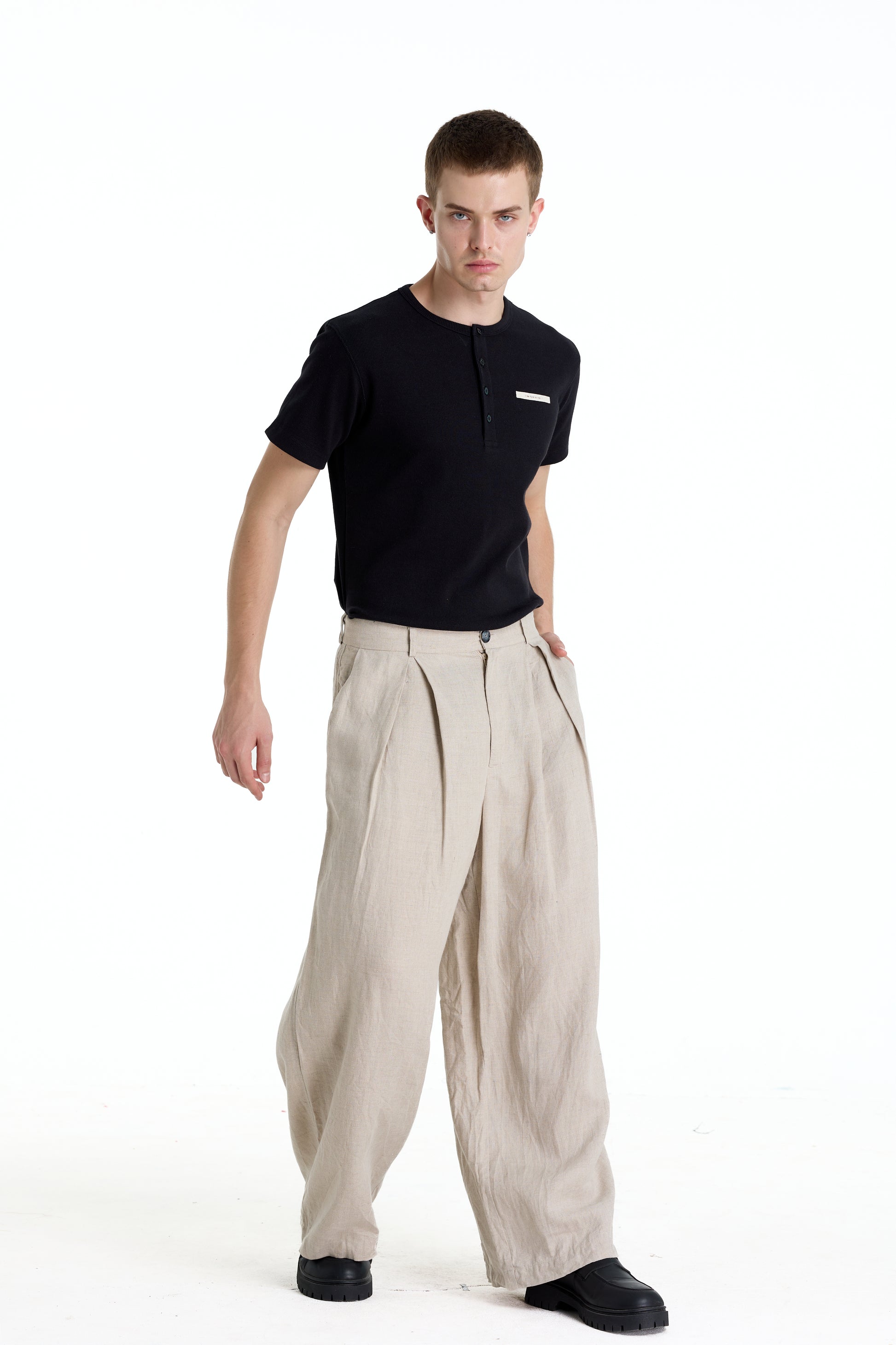 Wide-leg linen trousers in a refined oatmeal tone, featuring a clean pleated front for a relaxed yet structured silhouette. Crafted from breathable natural linen, the fabric offers a soft drape and exceptional comfort, ideal for warm climates. The minimalist design and neutral color make these trousers easy to style for modern smart-casual and everyday wear.